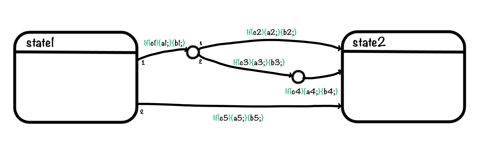 Also, the junctions create nested if statements (branching) and for for the state machine to go from one state to another, all the branches in one path should be valid, all at the same time.
